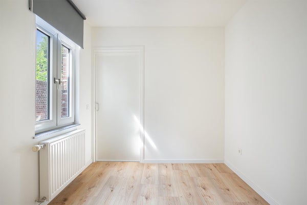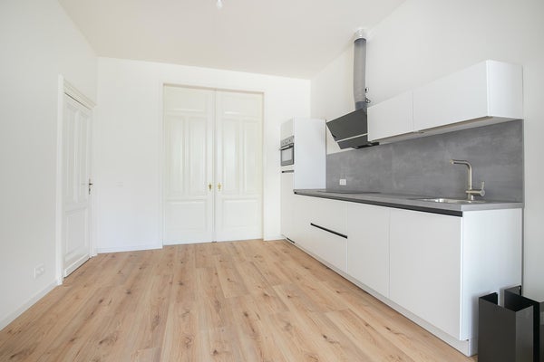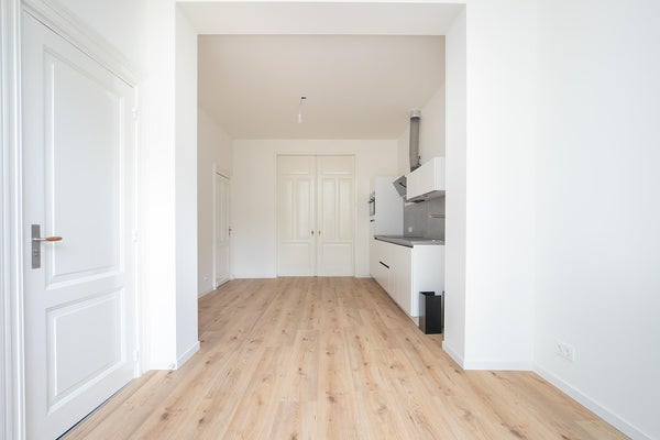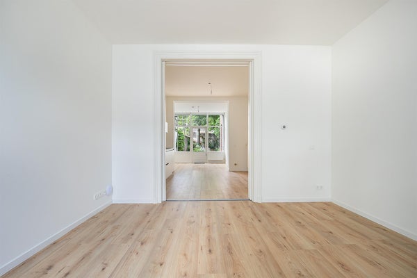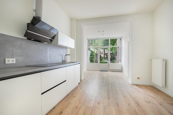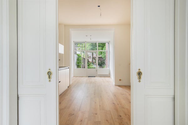 De woonkamer en keuken zijn afgewerkt met een lichte laminaatvloer en genieten van veel natuurlijk daglicht dankzij de karakteristieke hoge raampartijen aan de voorzijde van de woning. Dit zorgt voor een prettige, open sfeer met een harmonieuze combinatie van modern comfort en klassieke charme.