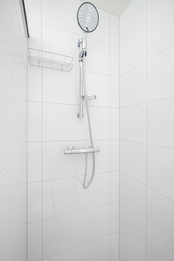 Via een tussenportaal is de slaapkamer bereikbaar. In dit gedeelte van de woning bevindt zich tevens de luxe badkamer, afgewerkt met moderne tegels en voorzien van een inloopdouche en elegant wastafelmeubel.
