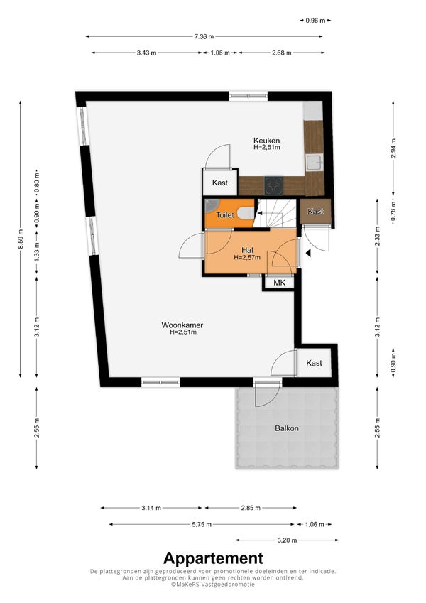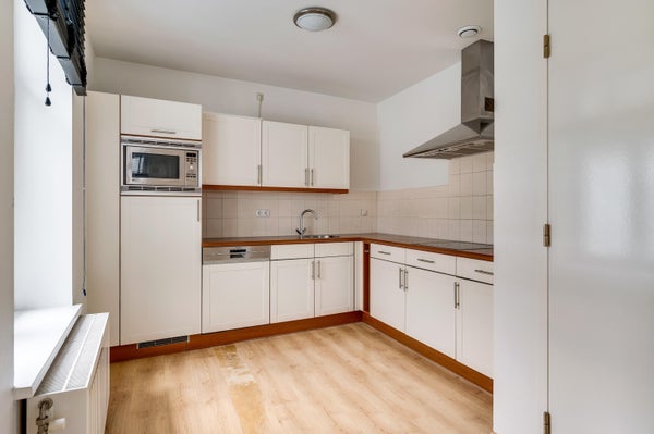 1e Verdieping: hal ca. 5 m² met toilet en trappartij. Woonkamer ca. 35 m² met openslaande deuren naar balkon ca. 8,5 m². Keuken ca. 12 m² voorzien van spoelbak, 4 pits keramische kookplaat, afzuigkap, combi magnetron oven, vaatwasser en koelkast.