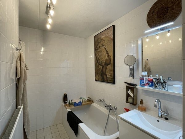 Verderop in de gang bevind zich een separaat toilet, de badkamer voorzien van ligbad, douche en wastafel.