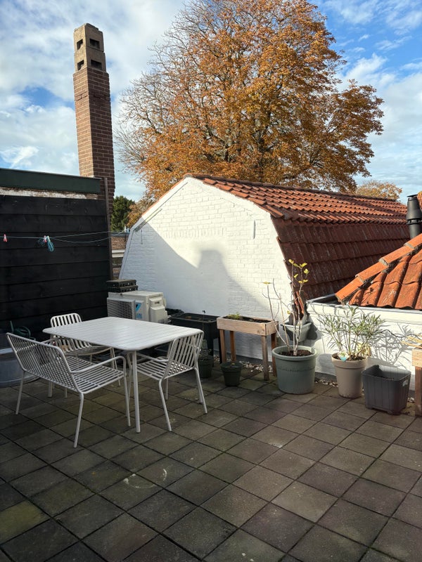 De ruime slaapkamer aan de achterzijde biedt toegang tot het riante dakterras, wat zich uitstrekt over de breedte van 2 panden. Er is ook een 2e logeer-/werk kamer (walk inn closet?) beschikbaar. De badkamer beschikt over een wastafelmeubel en (regen)douche alsmede een wasmachine aansluiting.