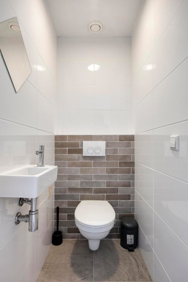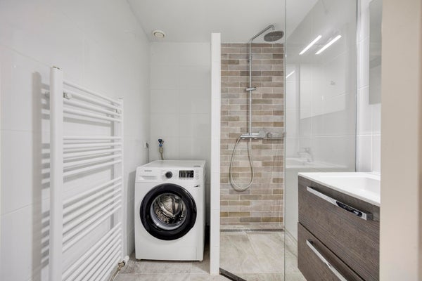 Badkamer met inloop douche, wastafelmeubel en wasmachineaansluiting