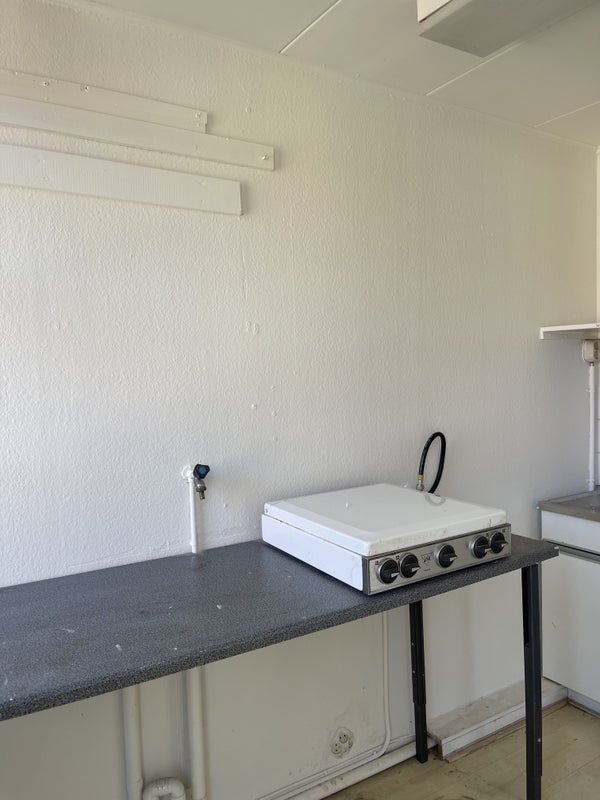 De studio wordt verwarmd door middel van een sfeervolle gaskachel.
