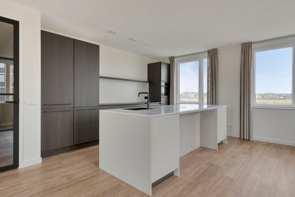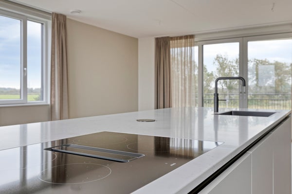 Stap binnen en laat u verrassen door het penthousegevoel van dit appartement. Slimme zichtlijnen zorgen ervoor dat u direct bij binnenkomst naar buiten kunt kijken, wat een gevoel van vrijheid geeft. De indrukwekkende raampartijen, die gedeeltelijk kunnen worden opengeschoven, verbinden het ruime balkon en het buitenleven met de woonkamer. Ook in de slaapkamer geniet u van de natuur, en met een en suite badkamer doet het denken aan een luxe hotelsuite.