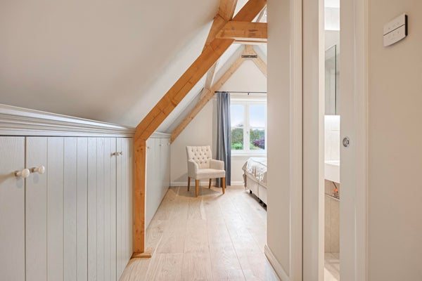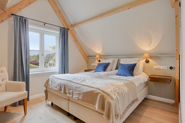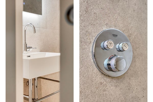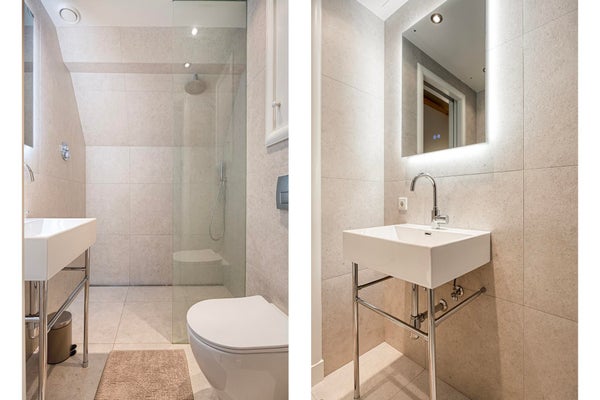 Naast de slaapkamer bevindt zich een luxe, moderne badkamer voorzien van een inloopdouche en toilet.