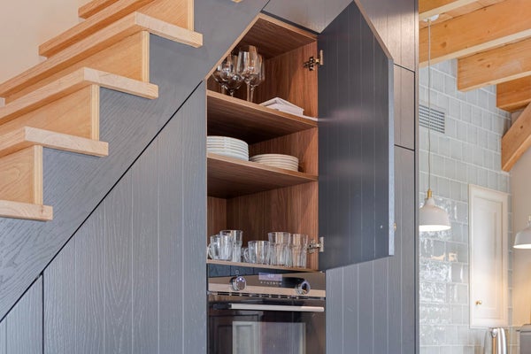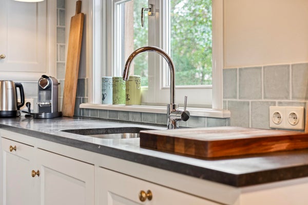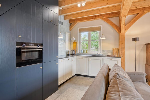 Bij binnenkomst valt direct de moderne en efficiënte keuken op, die slim is opgesteld onder de trap. Keuken is voorzien van onder andere koel-vries combinatie, combi ovenmagnetron, Bora inductie kookplaat met geïntegreerde afzuiging, vaatwasser, nespresso apparaat, waterkoker en wasmachine en droger. Ook is er airco geïntegreerd waardoor het tijdens warme zomerdag toch aangenaam is.