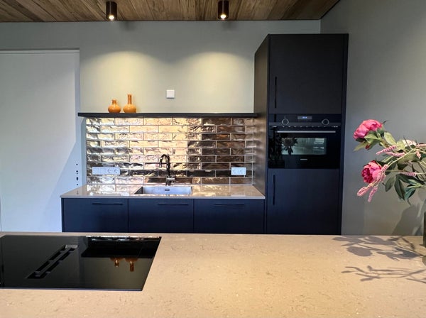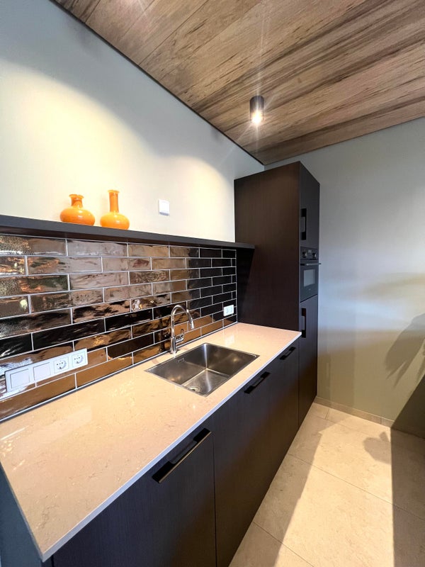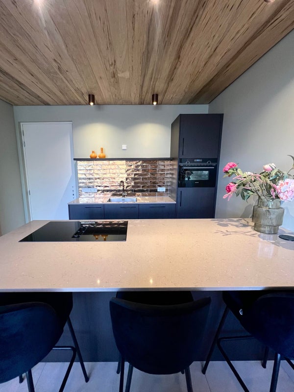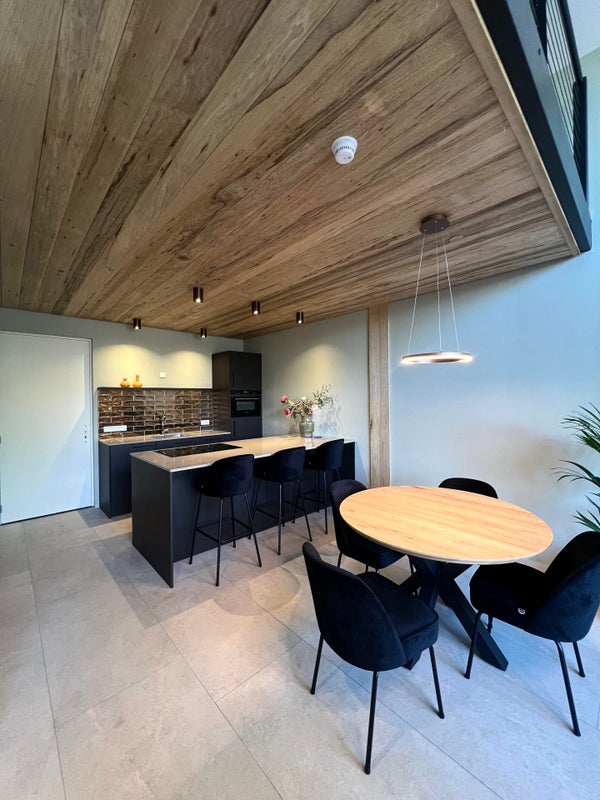 - Open keuken met gezellige eetbar en alle gewenste inbouw apparatuur, waaronder inductie kookplaat met afzuiging, koelkast met vriesvak, combi-ove/magnetron en vaatwasmachine.