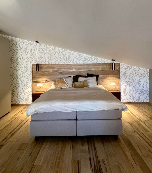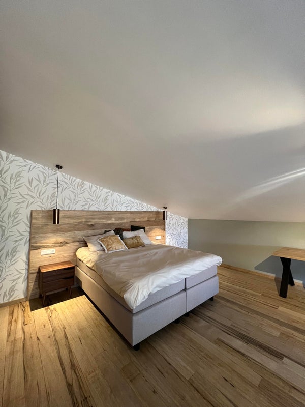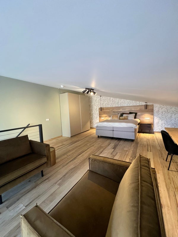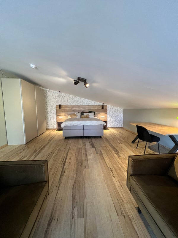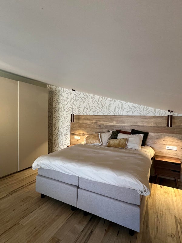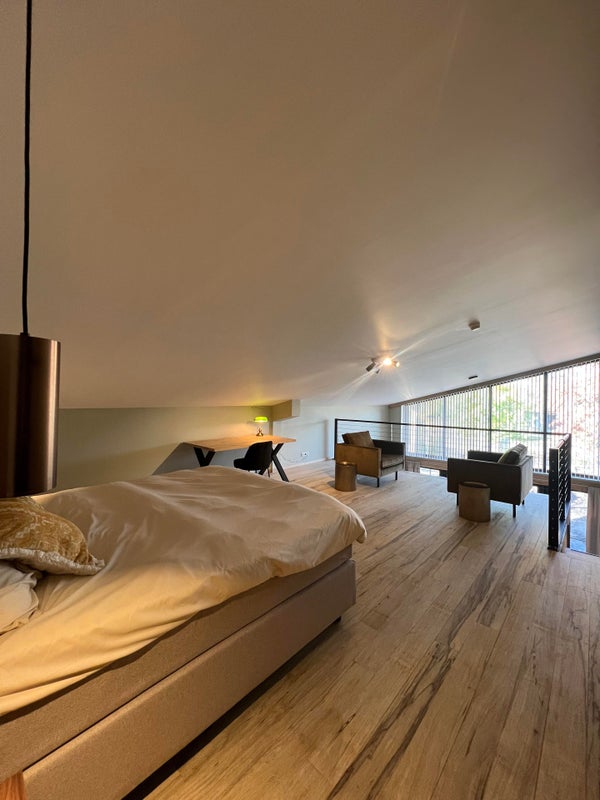 - Riante slaapvide/verdieping met luxe tweepersoons "hotel boxspring," kledingkasten en ingerichte werk-/studeerplek.