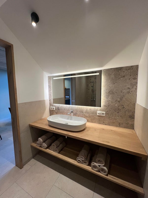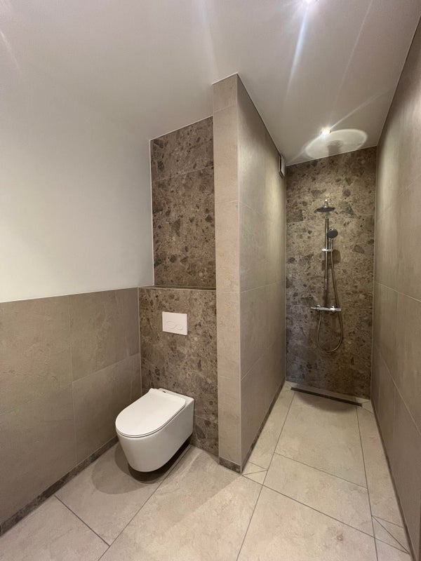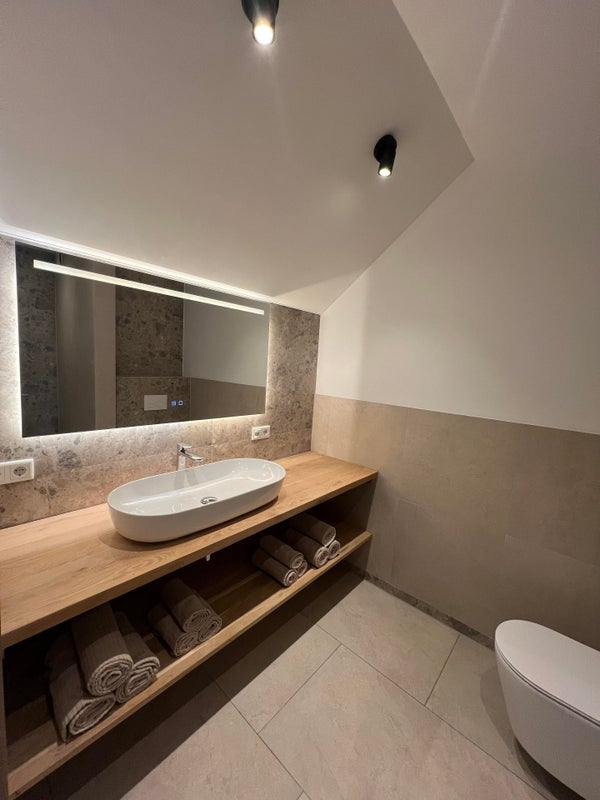 - Badkamer met deisgn wastafelmeubel, verlichte -en verwarmde spiegel, inloopdouche, toilet en handdoeken radiator.