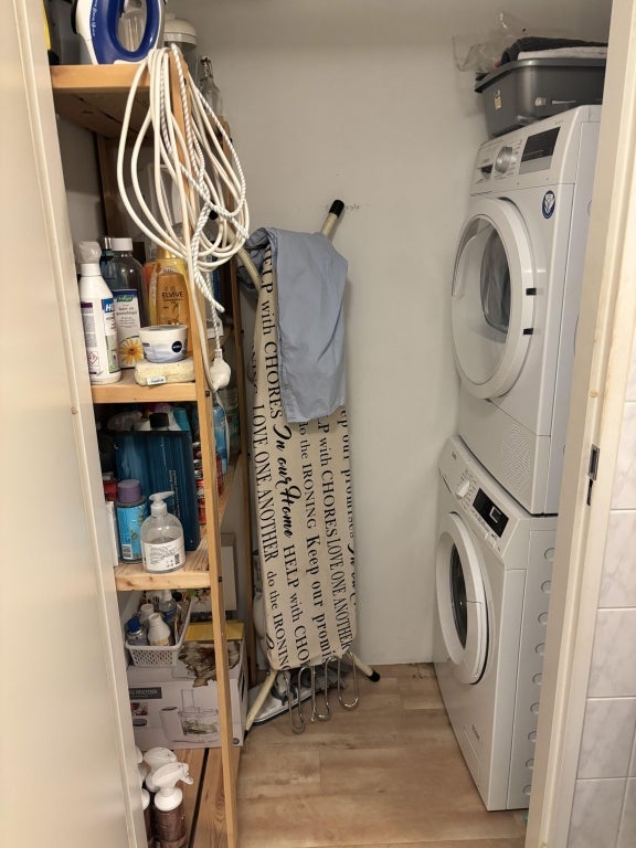 De badkamer in lichte kleurstelling beschikt over een inloopdouche, wastafel en toegang naar de praktische wasruimte. Het toilet is los van de badkamer gesitueerd in de hal. De ruime woonkamer is circa 36 m2 groot, samen met de keuken en heeft veel natuurlijke lichtinval vanwege de grote raampartijen. De moderne keuken is voorzien van een inductie kookplaat, koelkast, vriezer en klimaatkast.