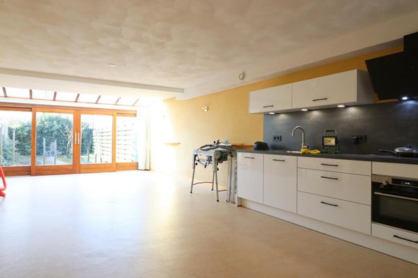 Algemene entree. Binnenkomst in de ruime woon-/slaapkamer met open keuken en toegang tot de tuin.