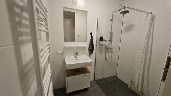 - (Deels) betegelde badkamer voorzien van inloopdouche, wastafel met meubel en spiegel en handdoekradiator;
