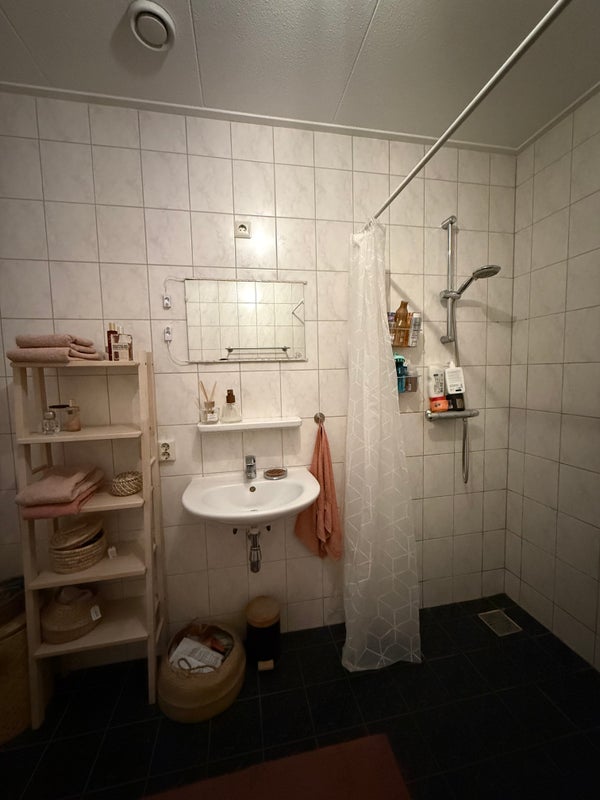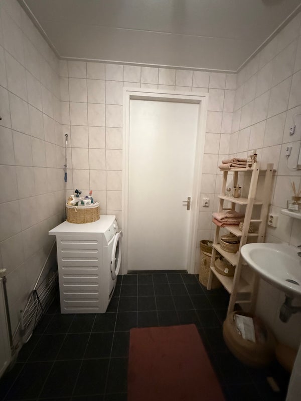 Het appartement heeft één slaapkamer met aangrenzende badkamer. In de badkamer bevindt zich een wasmachineaansluiting. De separate toiletruimte grenst direct aan de hal.