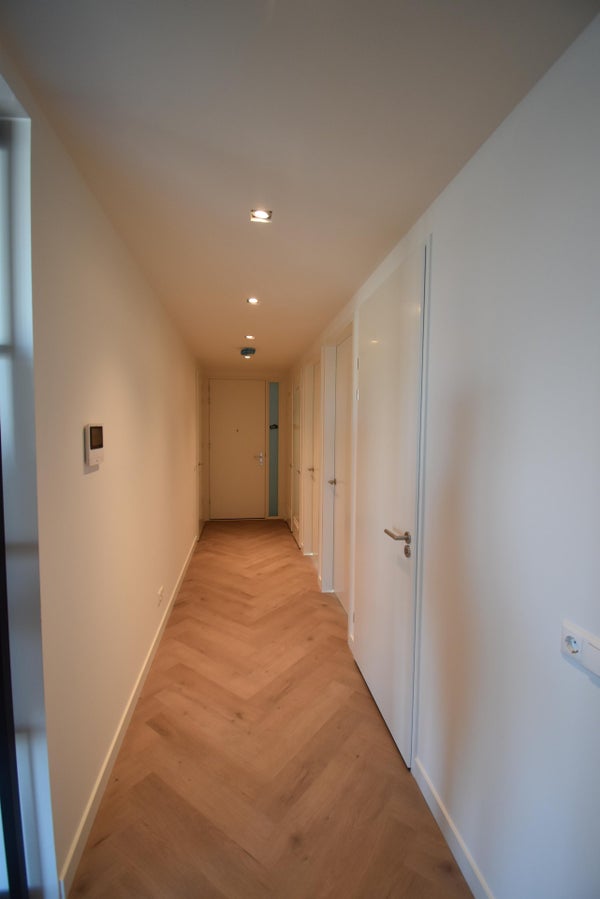 Een lange gang biedt entree aan dit ruime appartement en is het middelpunt van de woning. Als eerste aan de rechterzijde is de berging met aansluitingen voor de wasmachine en droger. Aan de linkerzijde zijn de meterkasten geplaatst. Hierna komt de toegang tot slaapkamer 2 (12 m2) met aangrenzend slaapkamer 3 (8 m2). Achter de 5e deur aan de linkerzijde is een tweede apart toilet geplaatst. Achter de laatste deur aan de linkerzijde is de badkamer. Deze is voorzien van een dubbele wastafel met spiegelkast, toilet, ligbad, een ruime inloopdouche, een hoge badkamerkast en een elektrische handdoekradiator. De laatste -3e- slaapkamer aan het einde van de gang, is met zijn 20 m2 zeer ruim te noemen. De intercom is geplaatst in de gang naast de deur van de woonkamer.