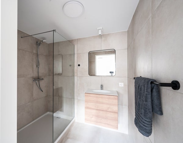 De badkamer heeft een douche, wastafel en toilet. In de kelder van het appartement bevindt zich de slaapkamer met een tweepersoonsbed en een kast.