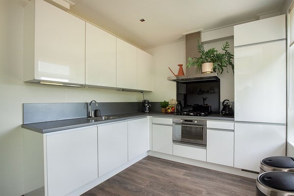 Entree appartement, ruime hal met intercom, separaat (hang)toilet met fonteintje, badkamer met inloopdouche, designradiator en wastafelmeubel, twee lichte slaapkamers waarvan een kamer met wasmachineaansluiting, royale lichte woonkamer met toegang tot het aangrenzende balkon dat onder andere beschikt over een zonwering en een handige, afsluitbare inbouwkast, moderne halfopen hoekkeuken met inbouwapparatuur waaronder een vaatwasser, koelkast, diepvries, gaskookplaat, afzuigkap en een combioven