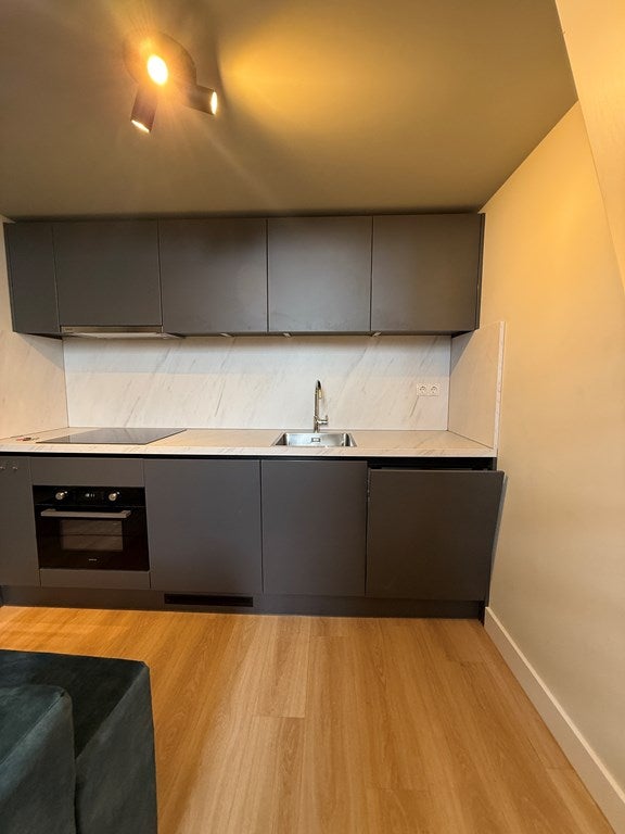 Keuken met apparaten (inductie, vaatwasser, koelkast, combimagnetron).