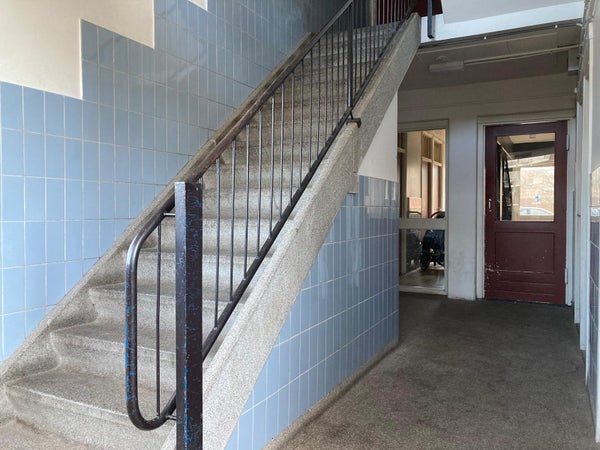 Entree in portiek met bellentableau, intercom en brievenbussen. Trap naar de eerste verdieping waar de entree van het appartement is gelegen.