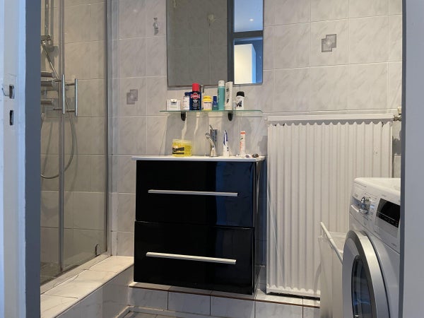 Vanuit de keuken is de badkamer te bereiken met douche, wastafel en opstelplaats van wasmachine en wasdroger.