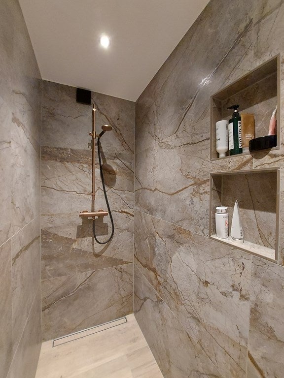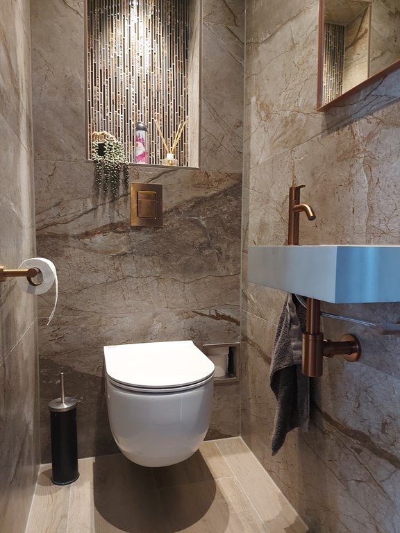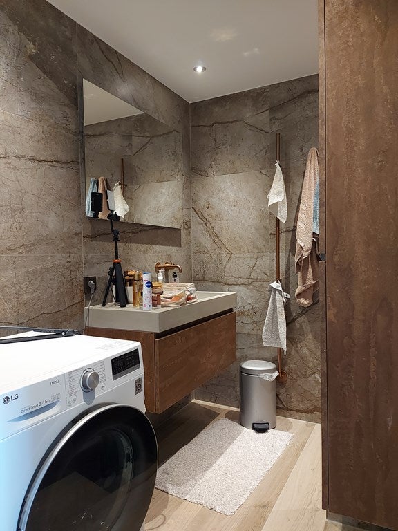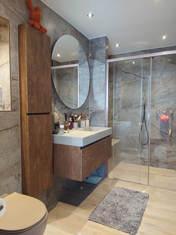 De woning beschikt over twee slaapkamers en twee luxe badkamers, waarvan één en suite. Alle sanitaire ruimtes zijn afgewerkt met hoogwaardig Italiaans marmer, wat zorgt voor een verfijnde en tijdloze uitstraling. Eén badkamer is voorzien van toilet; daarnaast is er een tweede separaat toilet aanwezig.