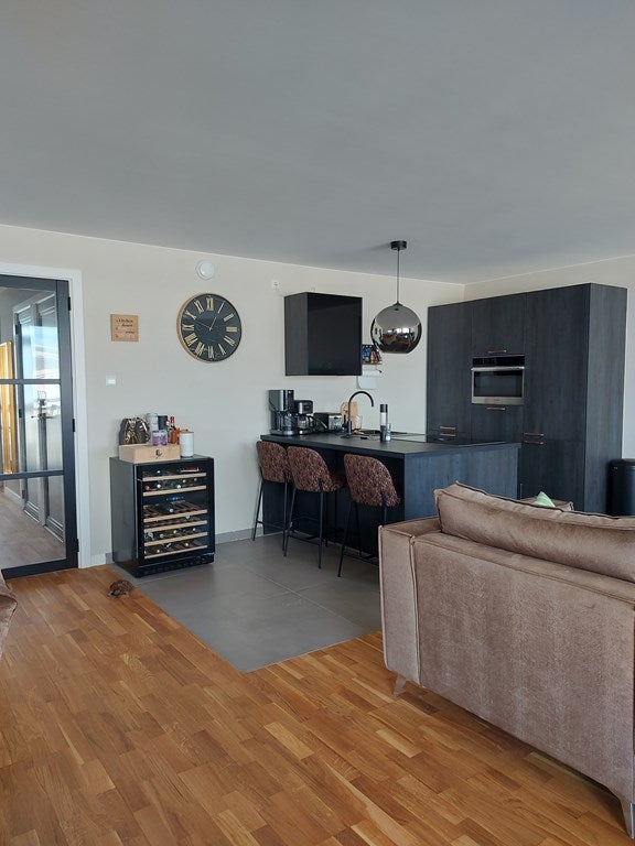 Gezellig woonkamer met houten vloer, prachtig uitzicht en een moderne open keuken met centraal kookeiland. De keuken is volledig uitgerust met alle denkbare inbouwapparatuur zoals een koelkast, vriezer, vaatwasser, combi-oven en inductiekookplaat met inbouw afzuigkap.