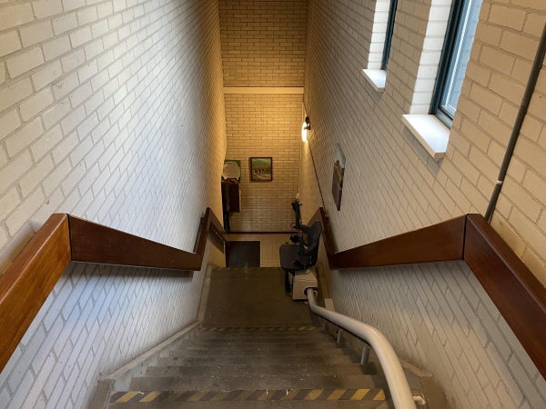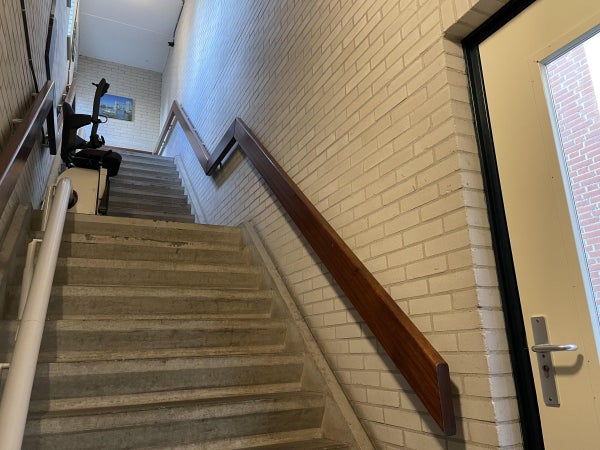 Begane grond: Entree aan de zijkant van het pand, waar er middels de trap of stoeltjes lift toegang is tot de eerste verdieping.