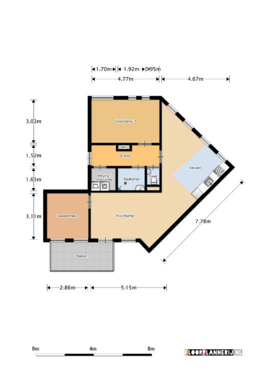 Entree appartement: Hal met meterkast, toilet en utility (wasmachine- en verwarmingsruimte). Ruime L- vormige woonkamer met toegang tot het zonnige balkon (Z), luxe open keuken voorzien van alle apparatuur.