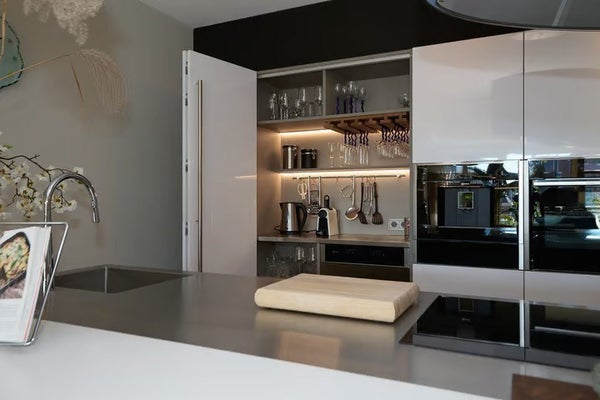 • Royale woonkamer met een designkeuken inclusief kookeiland, stoomoven, koffiemachine en Amerikaanse koelkast.