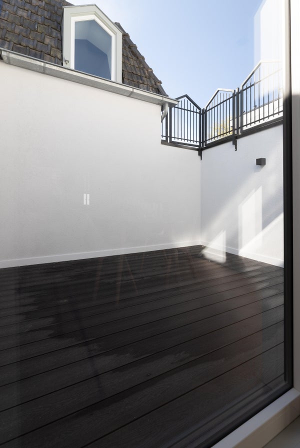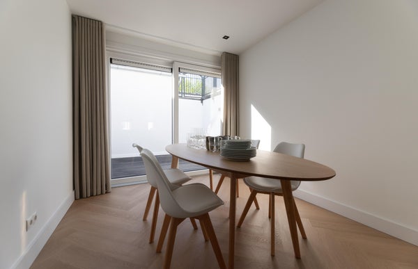 In het verlengde van de keuken is een eetgedeelte gecreëerd met voldoende ruimte voor vier personen en directe toegang tot de tuin. Boven in de woning bevinden zich twee slaapkamers en een badkamer. De luxe badkamer beschikt over een ruime inloopdouche met regendouche en een elegant badkamermeubel met grote ronde spiegel. Tevens zijn zowel de wasmachine, de droger als een extra toilet aanwezig in de badkamer.