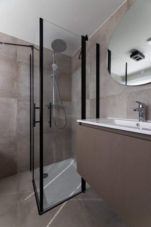 Boven in de woning bevinden zich twee slaapkamers en een badkamer. De luxe badkamer beschikt over een ruime inloopdouche met regendouche en een elegant badkamermeubel met grote ronde spiegel. De masterbedroom is voorzien van een comfortabel tweepersoonsbed en voldoende kastruimte. Daarnaast is er een kleinere slaapkamer uitgerust met een eenpersoonsbed. Via de hal is tevens een zonnig en ruim dakterras te betreden.