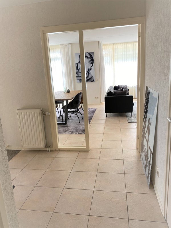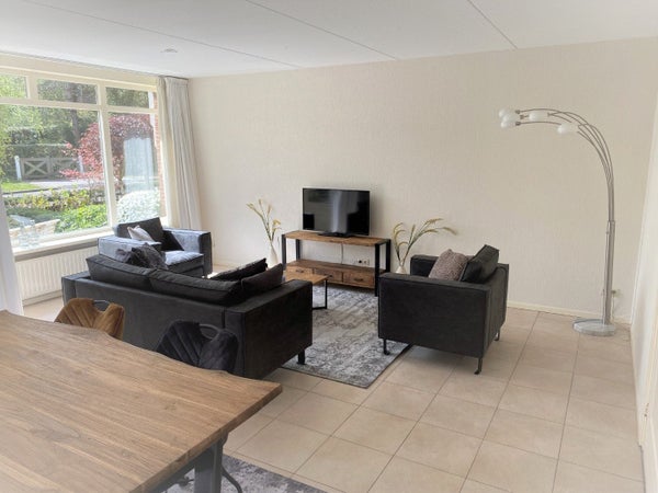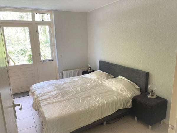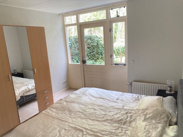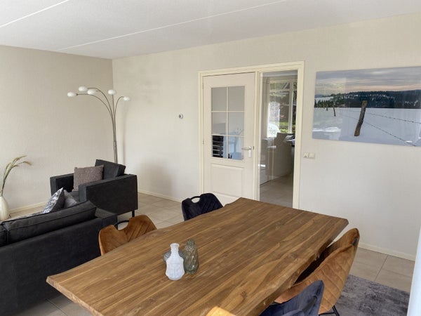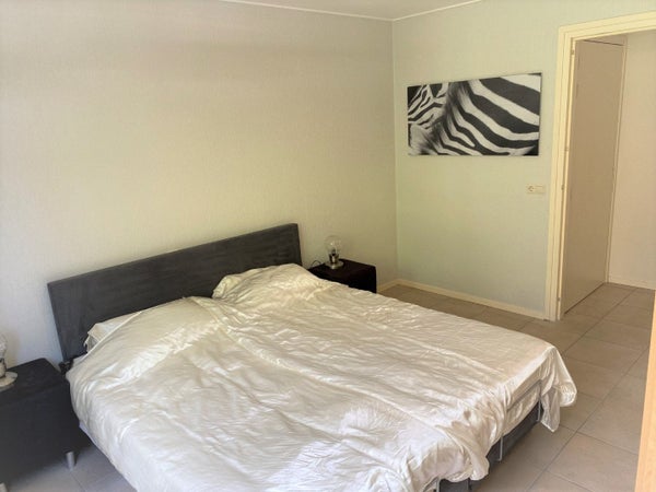 Indeling, ingang, grote gang, badkamer met bad, aparte douche, luxe wastafel, hangtoilet, wasmachine en droger. Lichte woonkamer (34m2) met deur naar een groot terras op het zuiden. Halfopen luxe volledig uitgeruste keuken met marmeren werkblad, vaatwasser, inductiekookplaat, koelkast/vriezer, magnetron/oven enz. Twee slaapkamers, beide met deur naar de tuin die ook een groot betegeld terras heeft. De tuin is aan de achterkant verbonden met het bos. Er is een grote kelder van 4*2 meter. Het huis is nieuw, de tegels zijn voorzien van vloerverwarming in het hele appartement. Beschikbaar voor korte of lange periode.