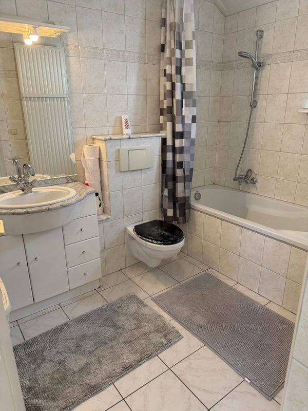 De badkamer is voorzien van een wastafel in meubel, bad/douche en toilet.