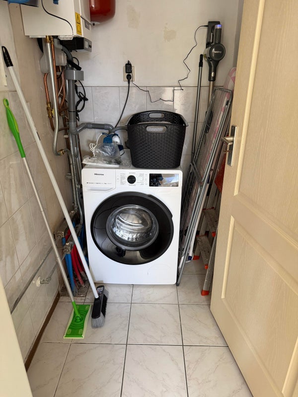 slaapkamer en bergingskast met wasmachine.