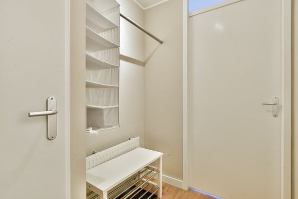 Entree op de tweede verdieping, met hal en gang naar twee slaapkamers aan de voorzijde van het appartement. De ruime woonkamer met halfopen keuken en balkon (loggia) zijn te vinden aan de achterzijde van de woning. De keuken is voorzien van diverse inbouwapparatuur, zoals vaatwasser en oven, en ingebouwd afzuigsysteem. Separaat toilet en berging met wasmachine in de gang. Badkamer met inloopdouche, handdoek radiator en wastafel.