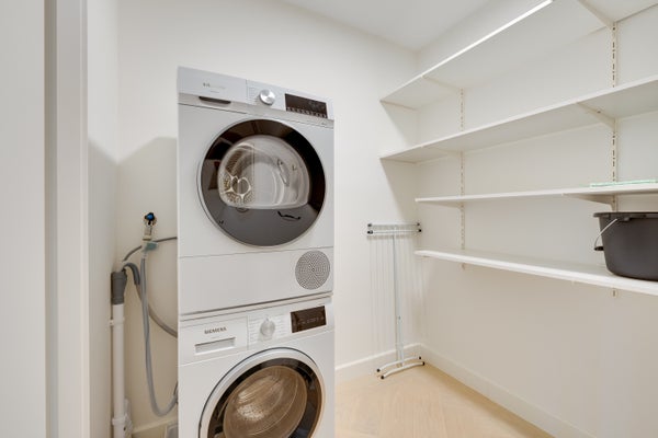 Aan de rechterzijde van de hal bevindt zich een praktische wasruimte met opstelling voor wasmachine en extra bergruimte. De woning beschikt over twee goed bemeten slaapkamers; de tweede slaapkamer is tevens uitstekend geschikt als werk- of logeerkamer.