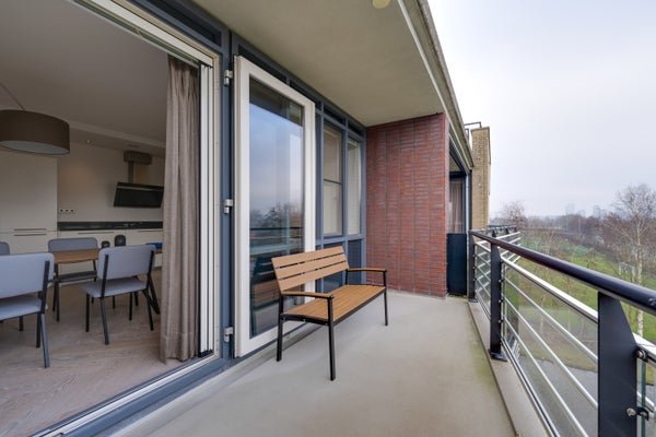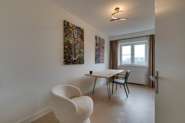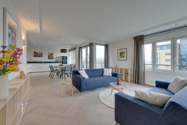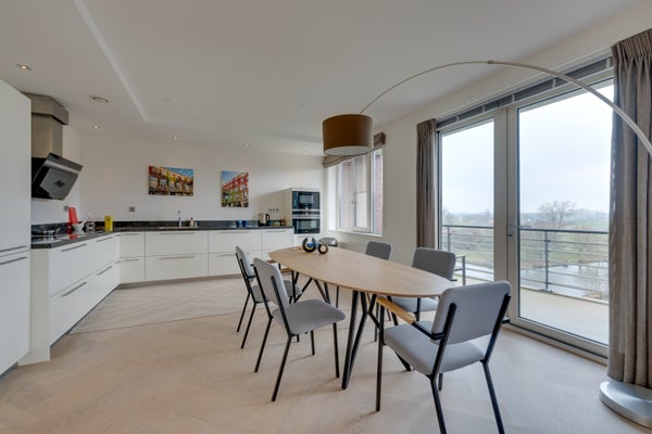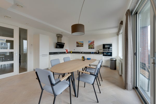 De royale en sfeervolle woonkamer is volledig gemeubileerd en biedt een comfortabele leefruimte met veel lichtinval. De moderne open keuken sluit hier naadloos op aan en is voorzien van diverse inbouwapparatuur. Vanuit de woonkamer is er toegang tot het balkon op het zuidoosten.