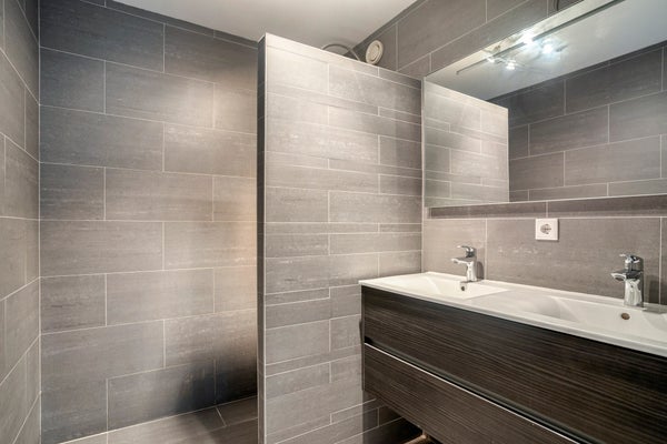 De badkamer is uitgerust met een inloopdouche, een dubbele wastafel, een ladekast en een grote spiegel. Er is een aparte toiletruimte en een aparte opslag-/wasruimte met aansluitingen voor een wasmachine en droger.