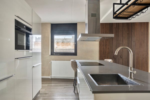 Het gebouw is toegankelijk via een beveiligde gemeenschappelijke ingang. Het appartement bevindt zich op de tweede verdieping en is bereikbaar via de trap. Vanuit de hal heeft u toegang tot alle ruimtes. De lichte woonkamer beschikt over grote ramen die veel natuurlijk licht binnenlaten. De moderne keuken met een kookeiland is volledig uitgerust met inbouwapparatuur, waaronder een vaatwasser, koelkast, vriezer, combi-oven, een 4-pits inductiekookplaat en voldoende opbergruimte.