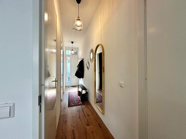 Zodra je het appartement binnenstapt, kun je niet om de lange, centrale hal heen. Hier krijg je meteen een gevoel van ruimte en overzicht. De hal vormt de spil van het huis: alle vertrekken zijn makkelijk bereikbaar en er is plaats genoeg om bijvoorbeeld een leuke kapstok of een moderne sidetable neer te zetten voor de nodige flair.