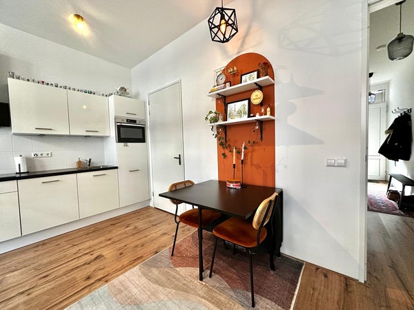 Loop je door, dan kom je in de lichte woonkamer waar je je gegarandeerd snel thuis zult voelen. De strakke vloer, grote ramen en frisse wandafwerking maken deze ruimte lekker uitnodigend. Hou je van koken of juist van gezellig samen eten? Dan komt de open keuken als geroepen. Die is helemaal van nu, met een moderne kookplaat en een strakke afzuigkap – ideaal als je een snel maaltje wilt bereiden of uit wilt pakken met een uitgebreid diner. De voorzieningen zijn bewust praktisch: er is ruimte voor een inbouwkoelkast én een oven, zodat je je eigen keuken kunt samenstellen naar smaak. En geloof ons – dat ga je waarderen!