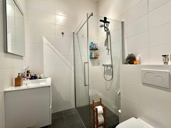 Het mag duidelijk zijn: ook in de badkamer is gekozen voor modern comfort. Je vindt hier een strakke douche en een toilet – allemaal netjes afgewerkt en helemaal klaar voor gebruik, dus geen gedoe met klussen of verbouwen. Verder is er een aparte wasruimte gecreëerd, zodat je je wasmachine en droger makkelijk kwijt kunt zonder dat het in het zicht staat. Wel zo prettig!