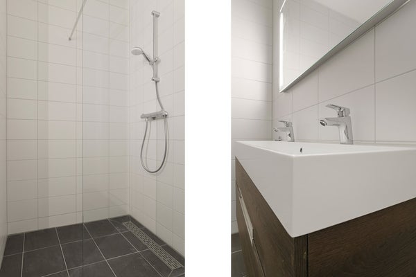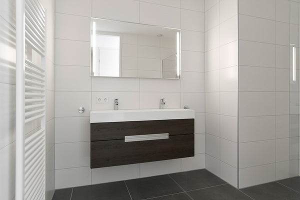 De badkamer beschikt over een dubbele wastafel met spiegel en ruime inloopdouche.