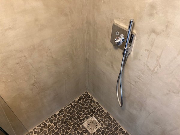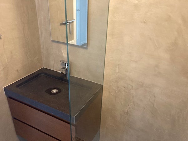 Badkamer met ruime inloopdouche, spiegel, wastafel en toilet.
