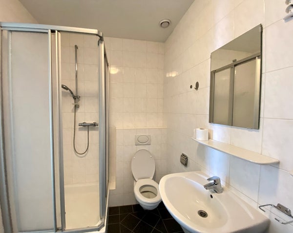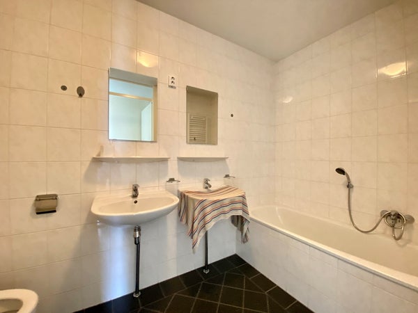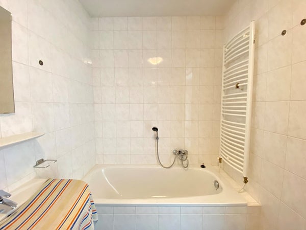 Ruime volledig betegelde badkamer die voorzien is van een toilet, ligbad, douche, dubbele wastafel met spiegel.