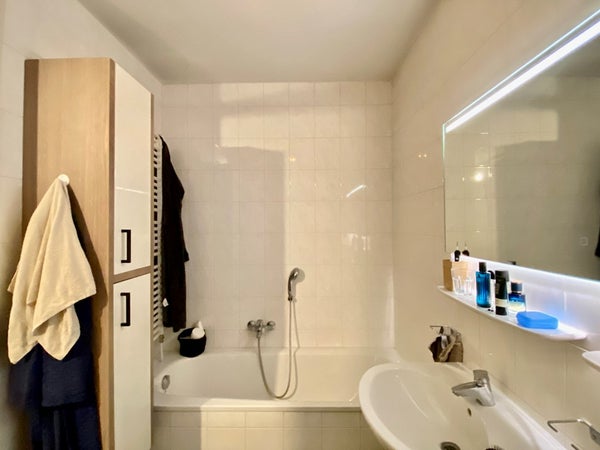 Ruime volledig betegelde badkamer die voorzien is van een toilet, ligbad, douche, dubbele wastafel met spiegel.