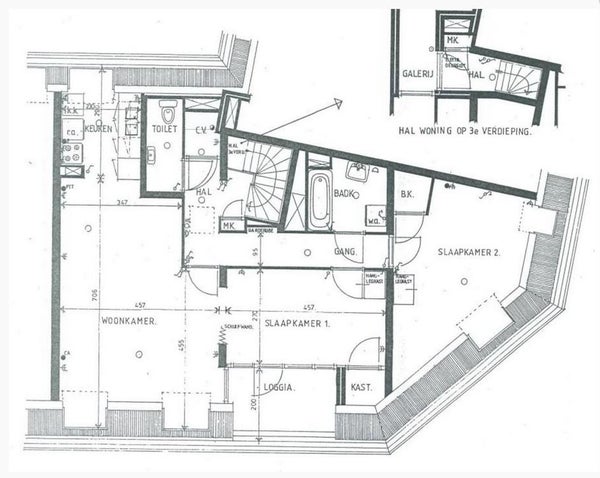 Na trap opkomst komt u terecht in de L-vormige hal vanwaar u toegang heeft tot alle vertrekken van dit speels ingedeelde appartement. Allereerst bereikt u de ruime woonkamer (ca. 32m²) met een 2 tal velux dakramen. De woonkamer staat in half-open verbinding met de keuken. Aangrenzend bevindt zich de eerste slaapkamer (ca. 12,5m²) met bergkast. Vanuit deze slaapkamer heeft u toegang tot uw loggia c.q. balkon.