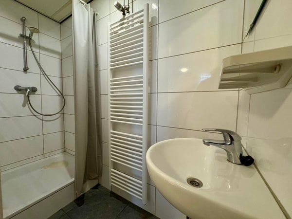 De badkamer is bereikbaar via de slaapkamer en voorzien van een douche en wastafel. Het toilet is separaat gelegen.