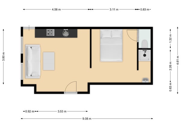 Via de voordeur heb je toegang tot alle vertrekken. De woonkamer beschikt over een open keuken, welke is voorzien van een keramische kookplaat, afzuigkap, koelkast en oven.