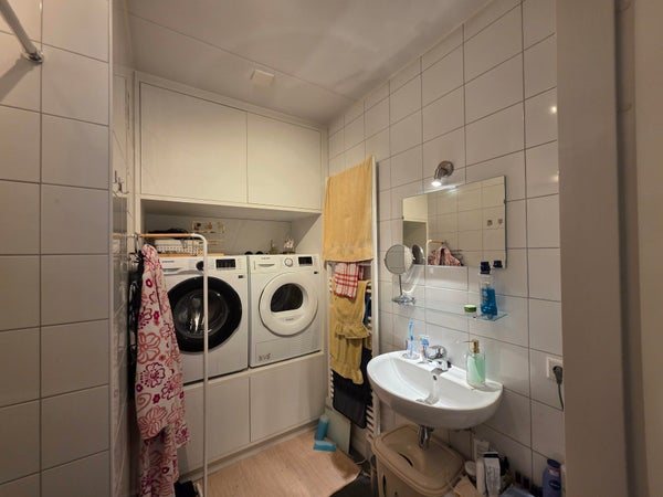 De badkamer is uitgerust met wastafel, spiegel, en douche. Tevens bevindt zich hier ook de aansluiting voor de wasmachine.