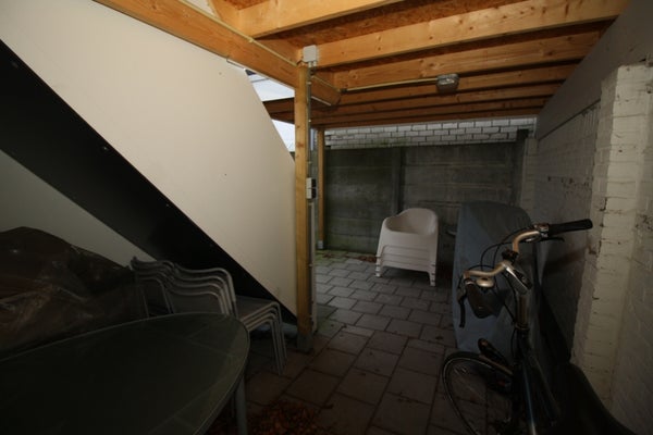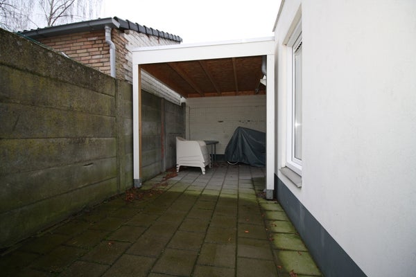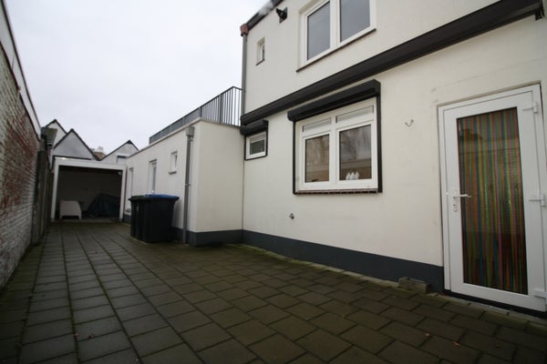 De bijkeuken geeft toegang tot de tuin. De tuin is onderhoudsvriendelijk en is volledig bestraat aangelegd en is voor een gedeelte overkapt. Via het gangetje naast de woning is de achtertuin te bereiken.